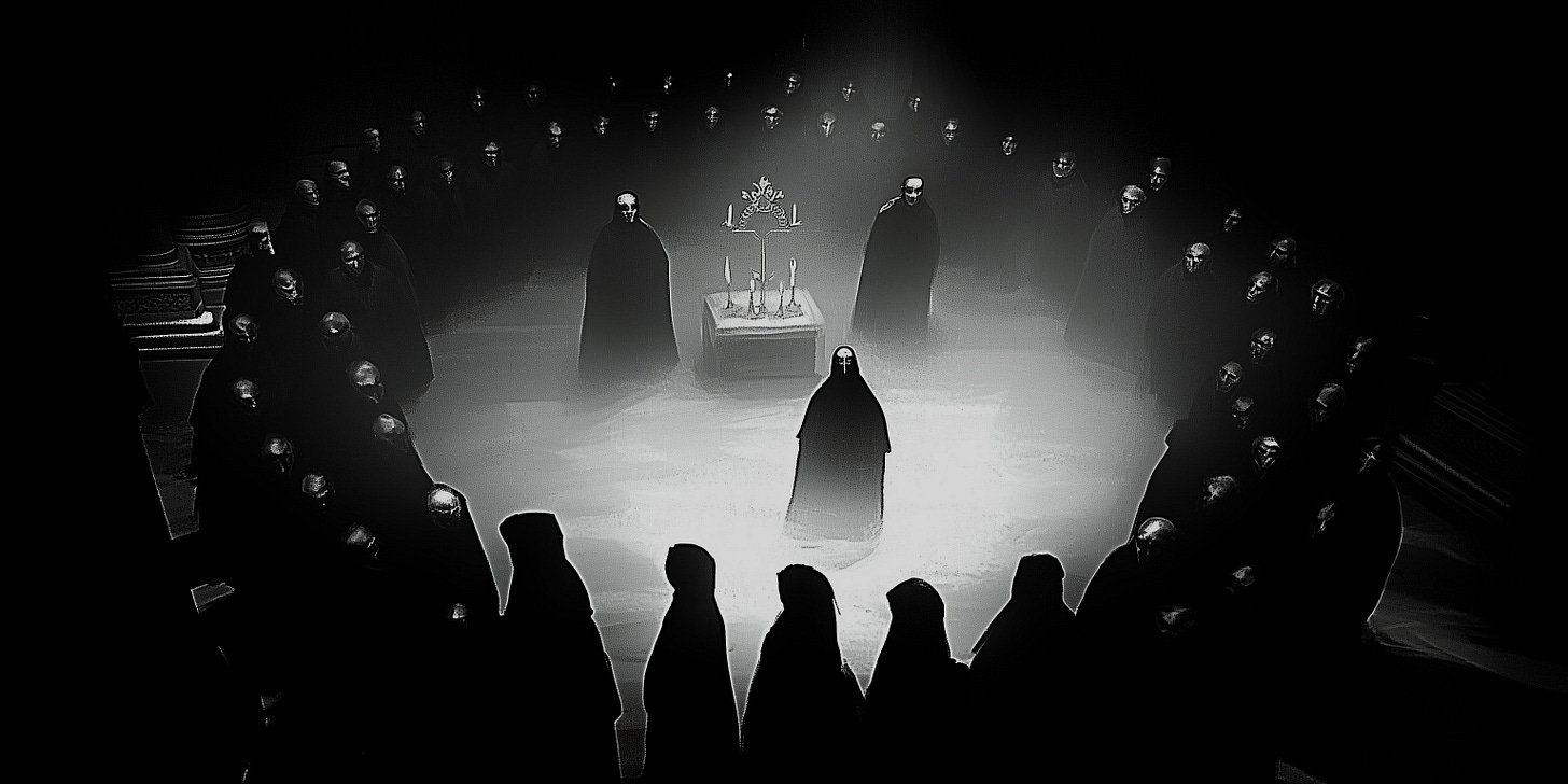 one of them reads from an ancient manuscript while others repeat the words in a low, hypnotic rhythm.